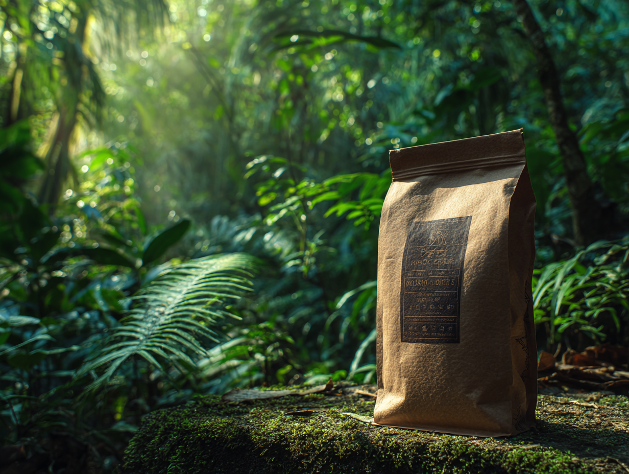 Bold, magazine-style layout showcasing origin story, fair trade credentials, and flavor profiles.